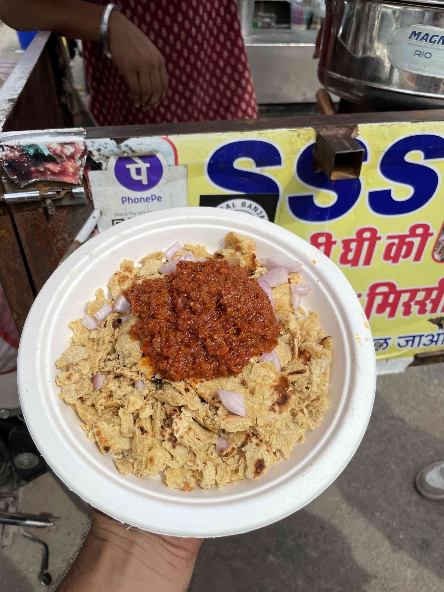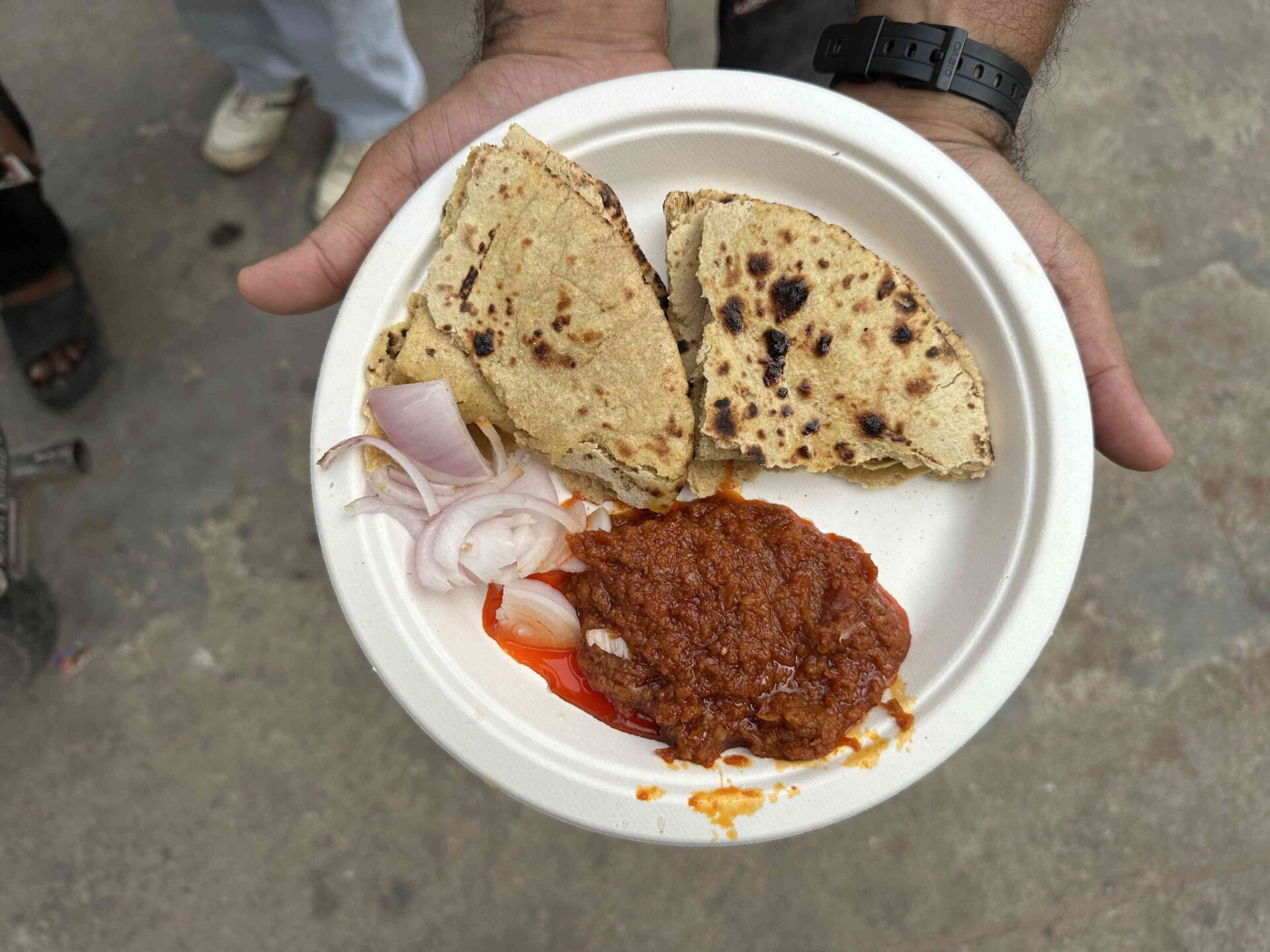 Ladle hot chutney; crumble roti with fingers, mix with ghee–onion–lemon, and eat | गरम चटनी डालें; रोटी उँगलियों से चूरें, घी–प्याज–नींबू संग मिलाकर खाएँ