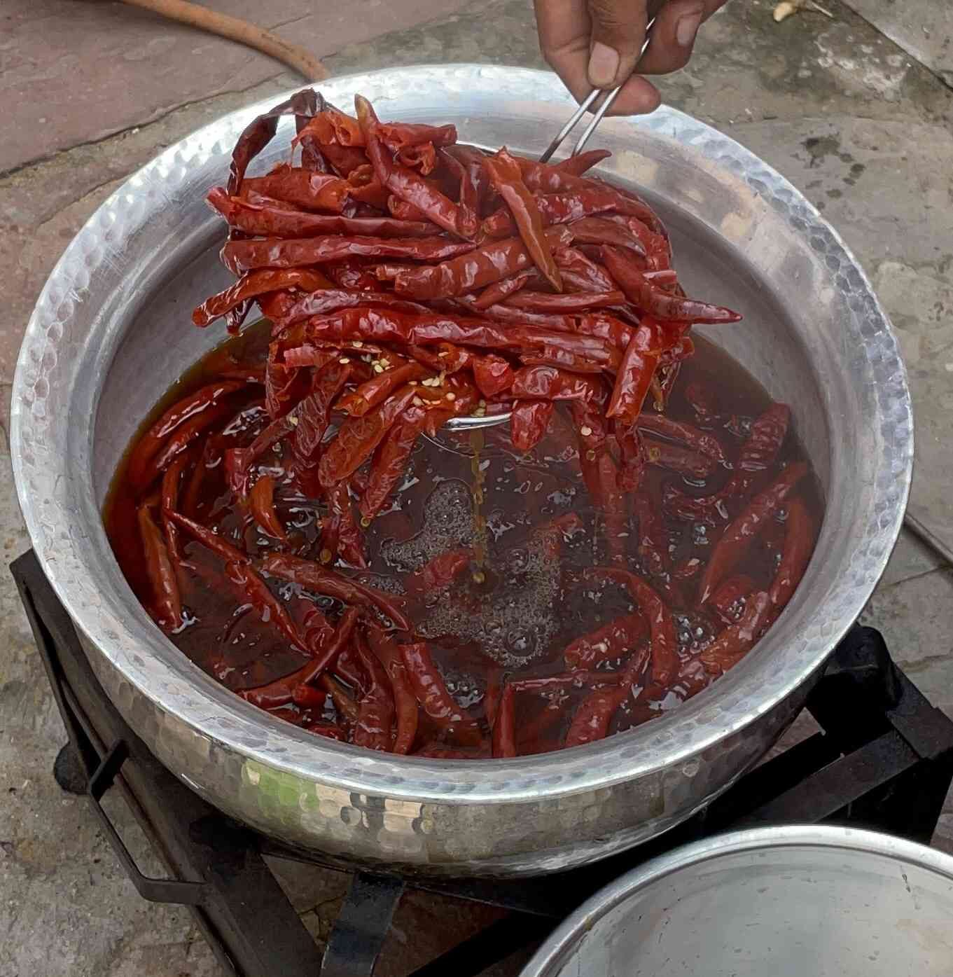 Soak whole red chillies overnight; in morning parboil briefly till they rise and soften, then turn off heat | साबुत लाल मिर्च रातभर भिगोएँ; सुबह हल्का उबालें जब तक फूलकर नरम हों, फिर गैस बंद करें